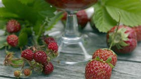 Skær rabarberne i tynde skiver. Skyl og nip jordbærrene og skær dem i skiver. Kom rabarber, sukker og vand i en gryde og kog dem møre. Tag gryden fra varmen og tilsæt jordbær. Lad det køle af og hæld frugten i 4 portionsglas. Pisk chokoladefløden cremet og læg den oven på frugten. Pynt med mynte.