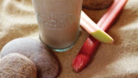 Skræl nogle flotte flager af det yderste røde på en af rabarberstængerne. Læg strimlerne i isvand, så de krøller. Skær rabarberne i 2 cm lange stykker. Damp dem med sukker og vanilje i 5 min. Frys rabarberne og lage til næste dag. Blend rabarberne med lage og mælk til en skummende shake. Kom en lille kugle is i hvert glas og hæld shaken over, pynt med rababerflagerne.