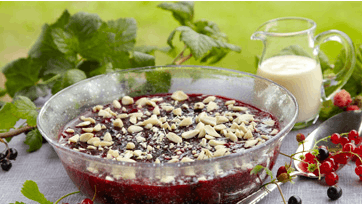 Skyl frugten og lad den dryppe af. Skær rabarberne i 2 cm lange stk. og udsten kirsebærrene. Hæld vand, sukker og den flækkede vaniljestang i en gryde og kog det op. Hæld rabarberne i og lad dem koge op. Kom bærrene i og lad dem stå ved svag varme under låg 4-5 min., til de lige begynder at briste. Jævn med kartoffelmel udrørt i koldt vand. Lad det stå et par min. på varmen uden at koge. Tag gryden fra varmen og hæld grøden i en skål. Drys sukker over, så den ikke trækker skind. Drys hakkede mandler på grøden, når den er kølet af.