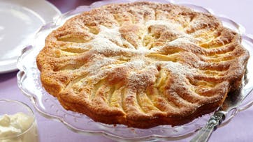 Bland mel, sukker og bagepulver. Rør mælk og olie i melet og pisk æggene i et ad gangen. Kom dejen i en smurt tærteform, skær æblerne i tynde både og læg dem over. Bag kagen ved 200° i 20 min. Drys med vaniljesukker og smørklatter og bag kagen yderligere i 5 min. Servér kagen lun med kold cremefraiche eller flødeskum.
