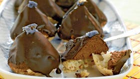 Imens kan hakket chokolade og fløde koges op og afkøles til det er flydende, men ikke stift. Hold øje med det. Piskes op til en ganache (creme), der kommes i en sprøjtepose og fordeles på den flade side af makronerne. De stilles i fryseren i 1 time og overtrækkes med smeltet, tempereret chokolade og pyntes. Har begrænset holdbarhed grundet fløden i cremen, men på køl kan de holde ca. 3-4 dage.