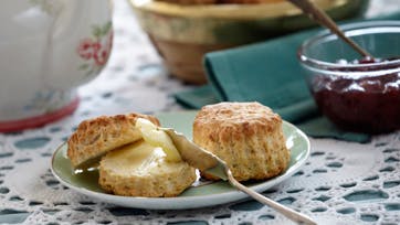 Spis dine scones lune med flødeskum eller smør og jordbærmarmelade.