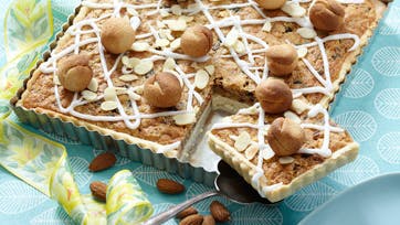 Saml ingredienserne til dejen, evt. i en foodprocessor. Rul dejen ud, så den passer til en form på ca. 20 x 30 cm. Dæk dejkanterne med alufolie, så de ikke glider ned. Bag bunden 10 min. ved 200º. Smør marmeladen på bunden, drys små stykker marcipan ud over. Pisk smør og sukker luftigt, pisk æggene med et ad gangen. Blend mandlerne og kom dem i æggemassen sammen med saft og revet appelsinskal, hakket og tørret frugt og krydderier. Rør hvedemelet i og kom fyldet i tærten. Bag kagen ved 180º i 35 min. Tril 11 - 12 marcipankugler og bag dem ved siden af kagen i 10 min. Rør flormelissen med lidt kogt vand til en jævn glasur og tegn streger hen over tærten. Drys med mandelflager og sæt kuglerne på kagen.