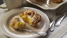 Saml ingredienserne til dejen og læg den koldt. Efter en time rulles den ud, og dejen bages i små forme til skaller i 20 min. ved 200°. Man kan med fordel bage dem i lag de første 10 min., så holder de på hinanden. Pisk æg og blomme sammen i en skål og sæt den over vandbad, mens du pisker smør, sukker og citronsaft i. Når det er som creme, tages det af varmen, og der piskes videre til køligere, før citronskallen kommes i. Så fyldes cremen i de bagte skaller og stilles i fryseren i 20 min. Æggehviderne piskes stive og seje med sukkeret, og massen toppes op på tærterne og bages ved 230° i 3-5 min., til de lige har fået lidt farve.