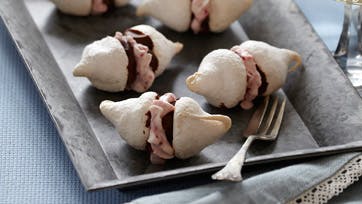 Gnid skålen med skærefladen på citronen. Kom æggehviderne i skålen og pisk, til de er halvstive. Tilsæt sukkeret ad 4 omgange, mens der piskes. Når massen er meget fast, piskes vaniljekorn og eddike i, og majsstivelsen sigtes i og piskes med. Fold 2 spsk. hindbærsyltetøj i marengsmassen og afsæt små toppe på bagepapir. Bag kagerne ved 150º i 1 time og afkøl dem. Hak chokoladen, bring 2 dl piskefløde i kog og rør chokoladen ud i fløden. Sæt cremen på køl, til den er smørbar. Pisk resten af fløden til skum og fold hindbærsyltetøjet i den. Kom chokoladecremen i en sprøjtepose og hindbærflødeskummet i en anden. Læg kagerne sammen to og to med de to slags creme imellem.