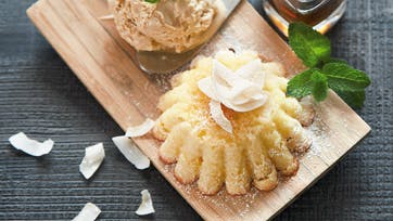 Rør kaffen ud i fløden og pisk den til skum. Pisk hviderne stive med 60 g af sukkeret og pisk resten af sukkeret med blommerne. Vend fløde og æggehvider i blommen og hæld iscremen i en fryseegnet beholder. Stil cremen i fryseren i mindst 4 timer, til den har sat sig. Rør smør, sukker og vaniljesukker blødt og cremet og del æggene i blommer og hvider. Rør æggeblommerne i smørret et ad gangen og bland mel, kokos og bagepulver. Rør melblandingen i skiftevis med yoghurten, pisk hviderne stive og vend dem i dejen. Kom dejen i 4 smurte portionsforme, fordel pærestykkerne over og drys med rørsukker. Bag kagerne ved 180° i 25 min. og servér dem med kugler af mokkais, drysset med ristet kokos.