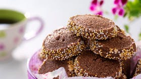 Mal mandlerne fint. Kom alle ingredienser i en foodprocessor og kør, til dejen er smuldret. Saml dejen og tril den til en pølse. Pensl med æggehvide og rul dejpølsen i kagekrymmel. Læg den i køleskab i mindst 30 min. Skær den ud i ca. 1 cm tykke skiver, og læg dem på en bageplade med bagepapir. Sæt dem i en 175° varm ovn i 12-15 min.