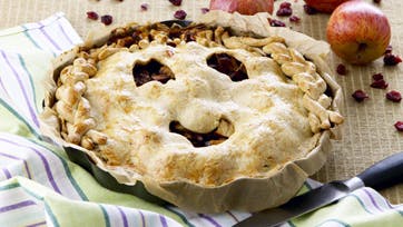 Bland mel, salt og sukker og hak smørret i. Saml dejen med vandet og læg den koldt i 30 min. Rul dejen ud til to 28 cm cirkler og læg den ene i en smurt 24 cm tærteform. Skær kernehusene ud af æblerne og skær dem i tern. Bland æbleternene med citronsaft, tranebær, sukker, kanel og kardemomme. Kom fyldet i tærtebunden og fordel smørret over i små klatter. Skær et ansigt ud i den anden dejcirkel og læg den over tærten som låg. Tryk kanten godt til og skær overskydende dej af. Lav "hår" af den overskydende dej og sæt det på og pensl med sammenpisket æg. Bag tærten ved 175° i 60 min. til tærten er gyldenbrun og fyldet bobler. Server tærten lun med kold cremefraiche eller flødeskum.