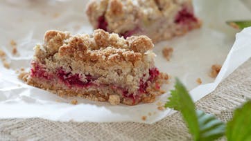 Smelt smørret og rør hvedemel, rugmel, sukker, bagepulver og salt i til en smuldrende dej. Tryk 2/3 af dejen ud i en lille bradepande beklædt med bagepapir ca. 20 x 30 cm. Skær bananerne i skiver og læg dem på dejen sammen med hindbær. Smuldr resten af dejen over. Bages midt i ovnen ca. 40 min. ved 200°. Lad kagen køle ca. 5 min. og skær den i passende stykker. De kan holde sig 2-3 dage i stuetemperatur eller fryses.
