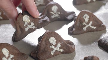 Bland mel, kakao og flormelis sammen i en skål. Hak smørret ud i melblandingen, tilsæt æggeblomme og vand og saml dejen. Stil dejen koldt i 30 min. Rul dejen ud i en 3 mm tykkelse og stik 6 cm runde kager ud med en dejudstikker. Tril 2 cm store marcipankugler og læg en på hver kage. Saml med 3 fingre dejen om marcipankuglen og bag dem ved 200° midt i ovnen 8 min. Lad dem køle af og dekorer dem med smeltet hvid chokolade.