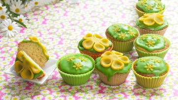Kom grøn glasur på muffinsene og sæt en eller flere blomster på hver.