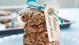 Pisk smør og sukker luftigt. Pisk olien i og tilsæt ægget. Bland mel, havregryn, kokos, vaniljesukker og bagepulver i en skål. Hak mandler, chokolade og rosiner groft og kom dem i melblandingen. Rør smørblandingen i og saml forsigtigt til en dej. Form boller på størrelse med bordtennisbolde og læg dem på en papirbeklædt bageplade. Tryk kagerne flade, ca. 1 cm tyk. Bag kagerne midt i oven ved 175° i ca. 20 min.