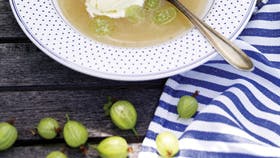 Smages til og kan evt. jævnes en anelse med majsstivelse. Ved servering kan grøden være lun eller kold og pyntes med skiver af stikkelsbær, der bliver flotte og gennemsigtige. I midten anbringes en god kugle vaniljeis.