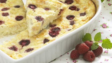 Smut mandlerne og hak dem groft. Pisk sukker og æg sammen og rør mel, hytteost og mælk i. Vend mandler og halvdelen af hindbærrene i dejen og kom den i en smurt 22 cm springform med bagepapir i bunden - eller i en hjerteform som her. Bag kagen ved 175° i 45 min. og server den lun sammen med letpisket flødeskum og resten af bærrene.