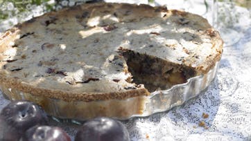Bland sukker, mel og smuldret smør til en grynet masse. Saml dejen med cremefraichen og rul den ud. Beklæd en 26 cm smurt tærteform med dejen og lad den hvile på køl i 30 min. Udsten blommerne, skær dem i tern og bland dem med madeiraen. Flæk vaniljestangen og kog den med vand og sukker til en sirupsagtig sukkerlage. Hæld sukkerlagen over blommerne og lad dem trække. Pisk smør og sukker luftigt. Rør mandler, chokolade, mælk, mel og æg i smørret til en let flydende dej. Fjern vaniljestangen og læg blommefyldet over tærtebunden. Fordel dejen over blommerne og bag tærten i ovnen ved 180° i 40 min. Server tærten lun med vaniljeis eller kold flødeskum.