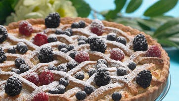Fyld: Smut og hak mandlerne. Rør ricotta med mandler og de øvrige ingredienser. Hæld fyldet i tærtebunden. Rul resten af dejen ud og skær den i strimler. Flet dem over fyldet. Bag tærten på midterrillen ved 200° ca. 35 min., til den er gyldenbrun. Afkøl tærten og pynt med flormelis og bær.