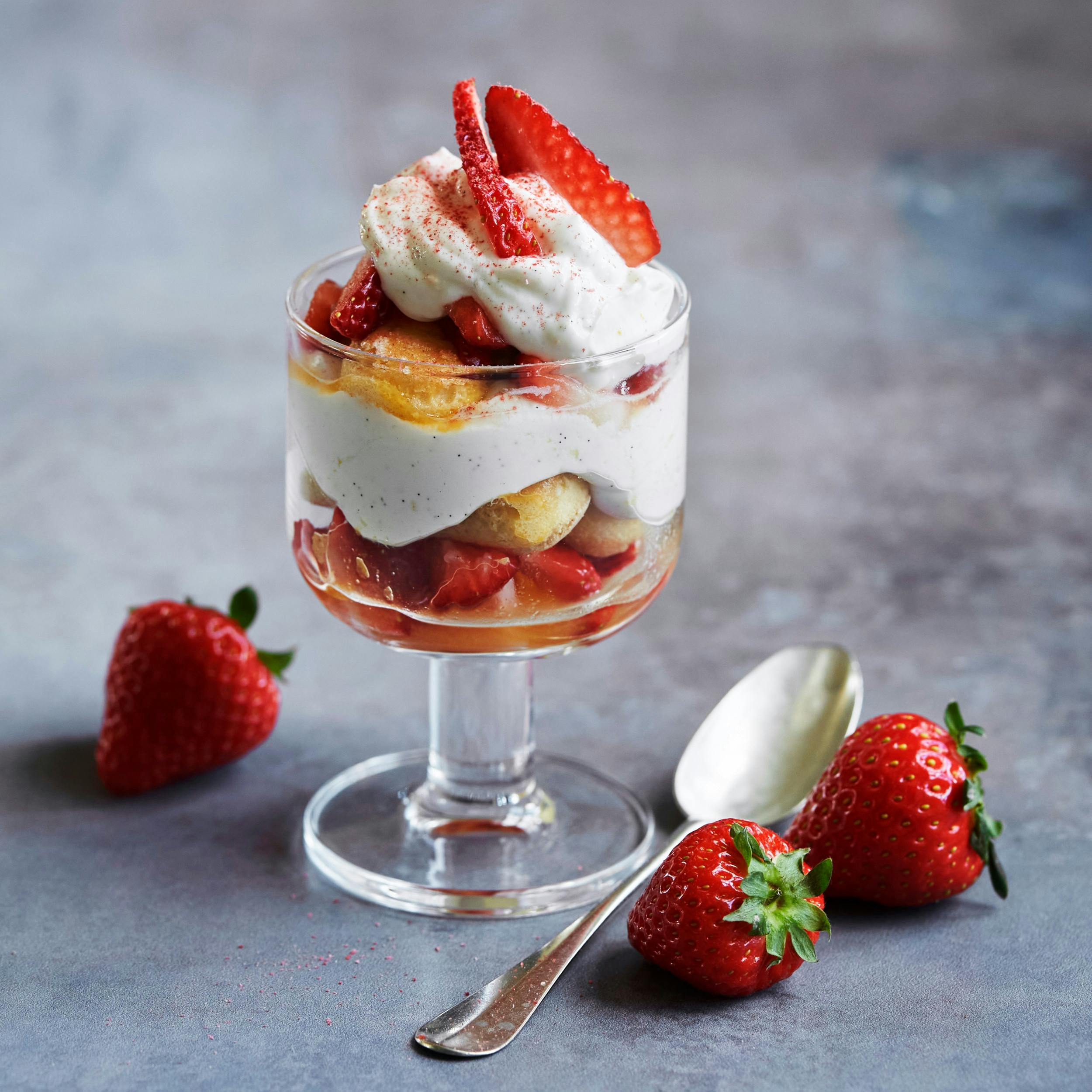 Læg jordbær, ladyfingers og mascarponecreme lagvis i 4 serveringsglas, og sæt glassene på køl i mindst 2 timer. Pynt evt. med ekstra jordbær lige før servering.