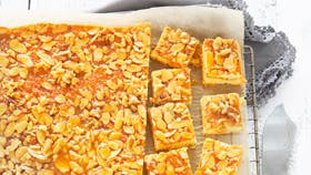 Smelt smørret og afkøl det. Pisk æg og sukker til en luftig æggesnapsen. Bland mel, vaniljesukker og bagepulver og vend det forsigtigt i æggesnapsen. Rør fløden og det afkølede smør i. Kom dejen i en beklædt form på ca. 30 x 35 cm og bag kagen 15 min. ved 175°. Smelt smør, sukker, sirup, mel og mælk, rør mandelflager og hakkede valnødder i. Fordel glasuren forsigtigt over kagen og bag den yderligere 15 min. Afkøl kagen på en rist.