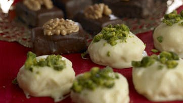 Rør flormelis med vand, til det er som fast glasur. Rør kokos i og smag til med rom og citronolie. Tril til kugler og tryk flade. Overtræk med hvid chokolade og drys med pistacie eller tynde lyse striber chokolade.