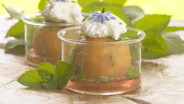 Prik fersknerne med en gaffel. Flæk vaniljestangen og skrab marven ud. Kog vand, sukker, citronskiver, vaniljemarv og -stang op i en gryde. Lad det småkoge 10 min. under låg. Læg fersknerne i og kog dem 4-5 min. Vend dem forsigtigt og kog yderligere 4-5 min. Tag gryden fra varmen og lad fersknerne køle lidt i væden. Tag fersknerne op og træk skallen af, mens de er lidt lune. Læg dem i en skål og hæld lagen over. Stil dem køligt med snittet mynte over til spisetid. De kan laves dagen før.