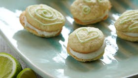 Pisk smør og sukker luftigt og rør æggene i et ad gangen. Bland mel, mandler og bagepulver og rør det i dejen sammen med fint-revet skal og saft fra limefrugten. Sæt dejen som valnøddestore klatter på en plade beklædt med bagepapir og bag dem ved 180° i 10 min. Rør flødeosten med vaniljekorn, flormelis og lemoncurd og læg kagerne sammen to og to med cremen. Dekorér kagerne med glasur og server.