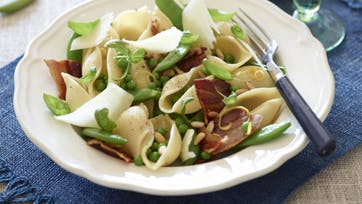 Riv citronskallen og svits den 1-2 min. sammen med sukkerærter i olivenolie. Tilsæt små grønne ærter og svits 1-2 min. Bland pasta, bacon, ærter og pinjekerner i pastagryden og lad det blive varmt. Tilsæt parmesan og smag til med salt og peber.
