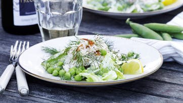 Ærterne bælges og drysses over salaten, som anrettes på tallerkner. Drys krabbekød over salaten og afslut med masser af frisk dild.