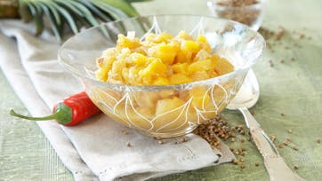 Hak løget fint. Del chilien, fjern kernerne og hak den fint. Lad løg og chili simre mørt i olien. Riv limeskallen og pres saften. Hæld det ned til løget sammen med sukker og kog det til sirup ved jævn varme. Skræl mango og ananas og hak frugtkødet. Bland frugt og sirup og tilsæt koriander. Lad det småkoge 4-5 min. Smag til med salt og peber. Opbevar chutneyen i køleskab.