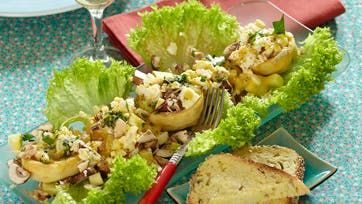 Hæld væden fra artiskokkerne. Skær æblerne i tern og bland dem med lidt citronsaft. Kog æggene hårde, 8-10 min., skyl og pil dem. Rens svampene. Hak æg og svampe. Del salaten i blade og læg dem portionsvis eller på et fad. Pisk dressingen sammen. Bland æbler, artiskokker og champignon med dressingen og læg det på salatbladene. Pynt med æg og persille og spis brød til.
