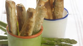 Skyl aspargesene og bræk enderne af. Pisk æg, cremefraiche, gedeost og peber sammen til en glat creme. Skær fillodejen ud i 40 firkanter på 7 x 15 cm, pensl med smør og læg dem dobbelt. Smør cremen ud på fillodejen, læg en halv skive skinke og en asparges på hver. Rul dejen sammen om aspargesene og pensl med resten af smørret. Bag rullerne ved 200o i 10 min. og server dem kolde i madpakken eller varme som snacks.