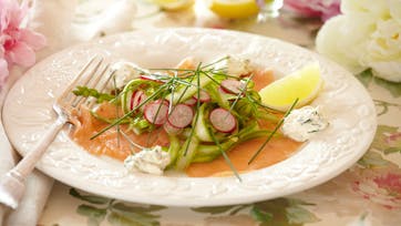 Skyl aspargesene og rens radiserne. Høvl aspargesene i tynde flager med en kartoffelskræller og skær radiserne i tynde skiver. Pisk citronsaft, olivenolie, salt og peber sammen og vend asparges og radiser i. Rør rygeosten med fløden og smag den til med salt og peber. Hak halvdelen af purløgene fint og den anden halvdel i 4 cm lange stk. Vend det finthakkede purløg i cremen. Anret lakseskiverne på tallerkner og læg aspargessalaten over. Sæt små skefulde af cremen rundt på tallerknen og drys med de lange stk. purløg øverst. Servér med lun flutes.