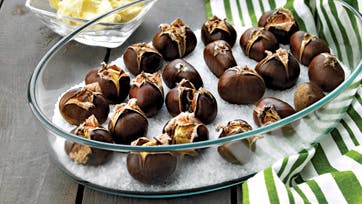 Bag kastanjerne ved 225° i 25 min., til krydset har åbnet sig, og kastanjekernen er mør. Pisk smørret luftigt med eddike og citronskal og server kastanjerne lune med smør og flagesalt.