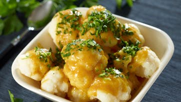 Del blomkålen i store buketter, kog dem næsten møre i letsaltet vand på omkring 8 min. Hæld kålen i en sigte og skyl med koldt vand.