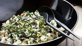 Del blomkålen i små buketter, der blancheres i 20 sek. i boblende, kogende vand med salt. Skyl straks med koldt vand. Skær æble i små tern og blegselleri i smalle stave. Rør dressingen sammen og vend kål, æble og blegselleri i dressingen. Drys med finthakket purløg og græskarkerner.