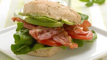 Steg baconskiverne sprøde og lad dem dryppe af på et stykke køkkenrulle. Rør mayonnaisen med sennep og skyl salaten. Skær tomaterne og avocadokødet i skiver og dryp med citronsaft. Flæk bollerne og smør dem med mayonnaise. Læg bollerne sammen med salat, avocado, bacon og tomat og server.