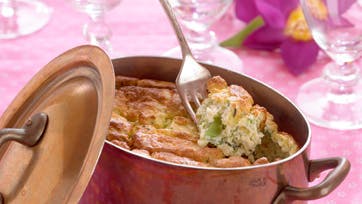 Damp broccolien i 2 min. og hak det hele groft. Sauter hakket løg i smør, drys med mel og rør det ud. Tag af varmen og rør det op med ricotta, hvidløg, æggeblommer, hakket broccoli og revet parmesan. Rør krydderier i. Pisk hviderne stive og fold dem i massen. Smør en 1½ liter souffleform, drys med rasp og kom massen i formen. Stilles i forvarmet ovn ved 180° i 45-60 min. Ovnen må ikke åbnes før efter 45 min. Server straks med salat og brød.