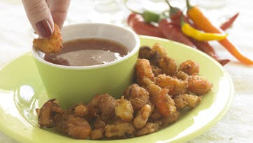 Bland mel, gryn, salt, løgpulver, hvidløgssalt, cayennepeber og peber. Pisk æggene sammen og pisk dem i melblandingen sammen med olie og øl. Stil dejen på køl og lad den hvile et par timer. Pisk dejen igennem og varm olien op, til den syder om spidsen af en tandstik. Dyp skaldyrene i dejen og steg dem lidt ad gangen i olien, til de er gyldne og sprøde. Lad skaldyrene dryppe af på et stykke fedtsugende papir og server med en god chili- el. tatarsauce.