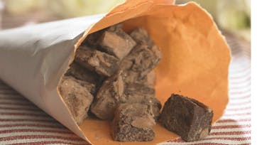 Bland fløde, sukker, sirup og kakao i en gryde. Kog blandingen op og lad den koge i 30 min. under låg. Skold og smut mandlerne. Smør et ovnfast fad på 10 x 15 cm med vindruekerneolie. Tag gryden af varmen, tilsæt mandlerne og hæld karamellen i fadet. Fordel karamellen i et jævnt lag og lad den afkøle. Skær karamellen ud i passende stykker og vend dem i kakao blandet med flormelis.