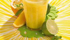Pres den ene appelsin og limefrugten. Skræl den anden appelsin og blend den med mango, saft, nøddeolie, honning og smag til. Pynt med en kvist mynte.