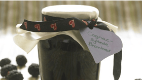 Rens og skyl bærrene. Kog vandet op i en gryde, kom sukker, lime i både og kanelstang i og kog under låg i 5 min. Tilsæt brombærrene og kog i yderligere 2 min. Tag gryden fra varmen og rør cognac i. Hæld de syltede brombær i skoldede glas.