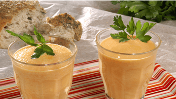 Skræl gulerødderne og skær dem i små stykker. Kog dem i suppen med porren, der også renses. Når det er mørt, blendes det hele, og