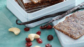 Skær stilken af fignerne og udsten dadlerne. Kom figner, dadler, tranebær, nødder og kornene fra vaniljestangen i en foodprocessor og blend det til en findelt masse. Rul massen ud mellem to stykker bagepapir og skær dem i felter på 3 x 5 cm. Læg bagepapir mellem stykkerne og opbevar dem i en kagedåse eller anden lufttæt beholder.