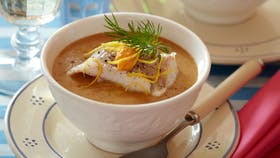Bring dåsens indhold i kog og smag til med vin og fløde. Skær fisken i fire stykker og overhæld den med kogende vand. Lad den trække heri i 3 min. og læg den i 4 varme suppetallerkner. Overhæld med rygende varm fiskesuppe og servér med ristet brød, hele overskårne hvidløgsfed til at gnide brødet med og rouille, der kommes i suppen i små skefulde eller smøres på hvidløgsbrødet.