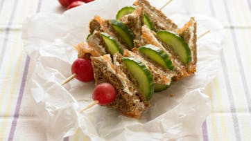 Smør rugbrødsskiverne med flødeost og læg dem sammen med laksen imellem. Smør wasabien ud på den øverste skive rugbrød og skær den i 8 trekanter. Sæt trekanterne på spid med agurkeskiver imellem og en radise på toppen.
