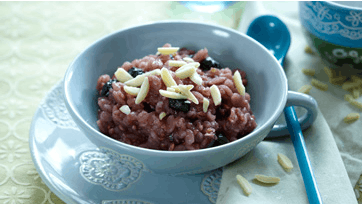 Kom kernerne i en skål, hæld det kogende vand over og lad dem udbløde i 5 min. Kog bygflagerne op med juicen og tilsæt kornene med vand og bærrene. Lad grøden koge under omrøring, til den tykner, ca. 3-5 min. Tag grøden af varmen og server den drysset med mandelsplitter.