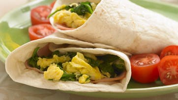 Lun tortillaerne, læg skinke og æg på og rul dem sammen. Server de lune wraps med purløg og tomat.