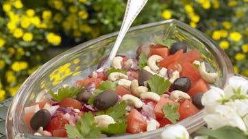 Skær melonen i bjælker. Bland rødløg, olie og salt og lad det trække en time. Rist nødder eller pinjekerner gyldne på tør pande eller i mikroovn. Bland vandmelon, løg og oliven. Drys nødder og nippet persille over og dryp med olivenolie. TIP Din vandmelonsalat kan blandes dagen før, men da melonen afgiver væde, når den er skåret, skal din vandmelonsalat drænes lidt, inden den forsynes med persille, nødder og olivenolie.