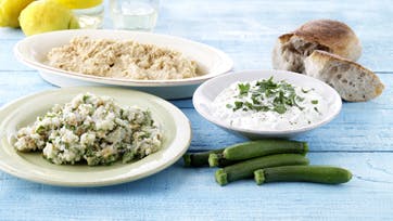 Riv agurken groft og pres vandet fra. Riv hvidløg fint og rør hvidløg og presset agurk i yoghurten. Smag til med salt og peber.
