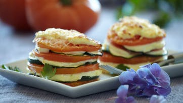 Skær tomaterne i meget tynde skiver. Drys dem med salt og peber. Skær courgetterne i tynde skiver. Læg tomaterne lagvist med courgtetter i otte små tårne (to til hver). Rør flødeosten med fintrevet hvidløg, parmesan og rosmarin og smør det midt i og øverst på hvert tårn. Sæt tårnene i et ildfast fad, dryp med olie og gratinér dem i ovnen i 25 min. ved 210º.