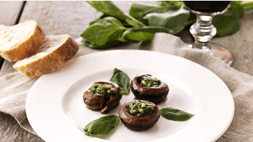 Rens svampene. Tag stokkene væk (gem dem til at strække en fars med). Rids svampene på oversiden og gnid ridserne med fintrevet hvidløg af det ene fed. Gnid med salt og olivenolie, kom også lidt i lamelsiden og stil svampene i ovnen ved 200° i 10 min. Blend imens pesto af det andet hvidløg, basilikum, pinjekerner, olie og det meste parmesanost. Læg det i hver hulning og drys med det sidste ost. Gratiner ved 225° i 5 min. Spises straks med brød til.